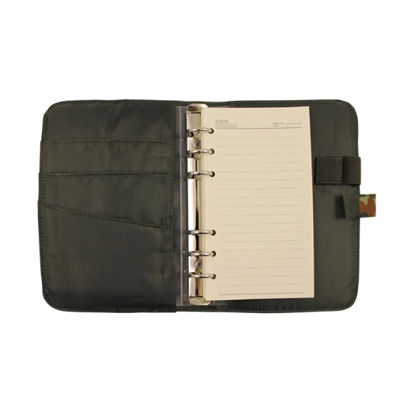 Taccuino militare ad anelli, con fogli carta da lettere formato A6 e rivestimento in tessuto 100% poliestere.