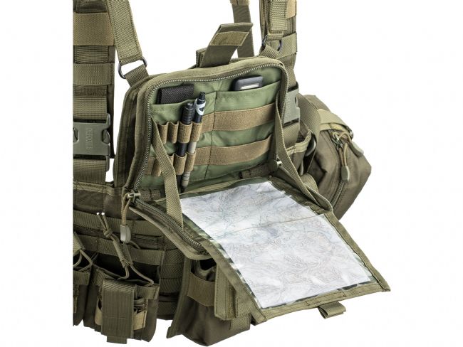 La configurazione modulare, basata sul sistema MOLLE, consente di personalizzare il chest rig in base alle proprie esigenze, aggiungendo tasche, porta-radio e altri accessori. Le numerose tasche, tra cui una tasca medica staccabile, una tasca porta-mappa e una per i caricatori esausti, offrono ampio spazio per organizzare l'equipaggiamento.