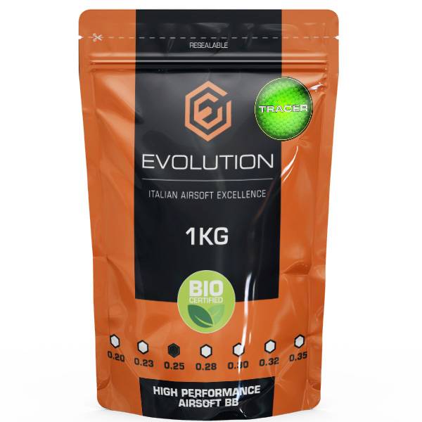 Pallini traccianti BIO High Performance TRACER da softair della Evolution Airsoft. Il sacchetto richiudibile è composto da 1Kg di pallini 0,25g di precisione made in Italy. Diametro 5,95mm ± 0,01mm di tolleranza.