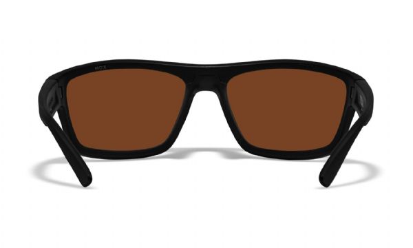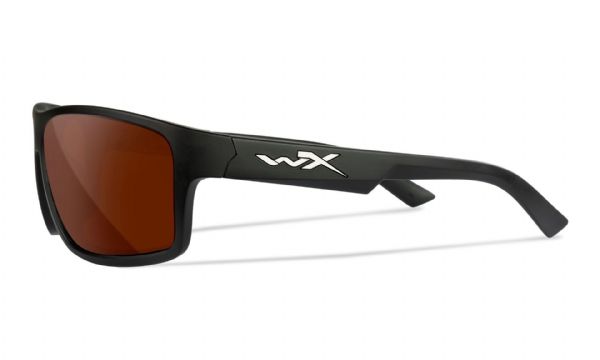 Occhiali Wiley X WX Peak. Lenti CAPTIVATE™ Polarized Copper (base rame), protezione 100% UVA/UVB/Luce Blu (HEV). Telaio Triloid™ Nylon avvolgente, lenti Selenite™ infrangibili, naselli in gomma per stabilità. Ideali per migliorare contrasti in condizioni di luce variabile.
