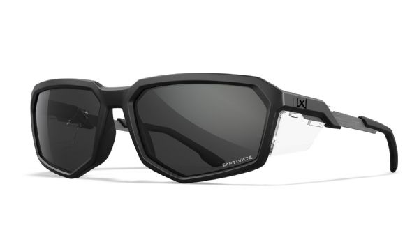 Occhiali Wiley X WX Recon. Design angolato ad alte prestazioni con lenti CAPTIVATE™ Grey (base grigia) per forte luminosità, che mantengono i colori naturali ed esaltano i verdi. Protezione 100% UVA/UVB/Luce Blu (HEV). Lenti Selenite™ infrangibili, includono scudi laterali rimovibili.