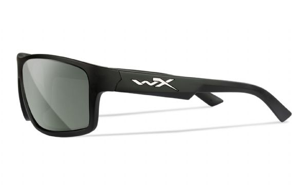 Occhiali Wiley X WX Peak. Design rettangolare avvolgente con lenti Silver Flash (base grigia, molto scure) con specchio Z-Oxide, protezione 100% UVA/UVB. Lenti Selenite™ infrangibili, telaio Nylon Triloid™, naselli in gomma per stabilità. Ideali per giornate di sole intenso.
