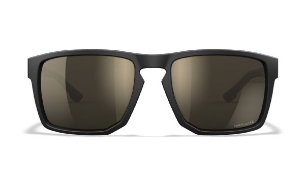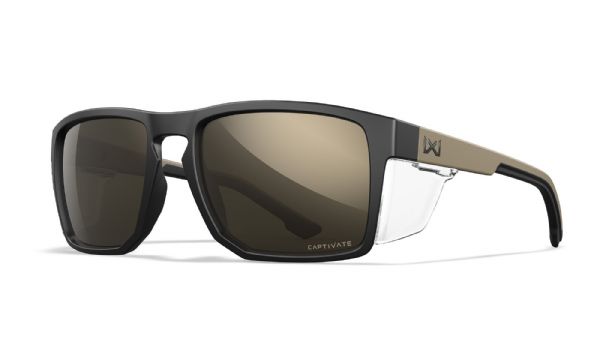 Occhiali Wiley X WX Founder, montatura Matte Black/Tan. Lenti CAPTIVATE™ Tungsten Mirror (base grigia) che esaltano contrasti e colori in condizioni di luce variabile. Protezione 100% UVA/UVB/Luce Blu (HEV). Lenti Selenite™ infrangibili, con scudi laterali rimovibili e naselli/terminali in gomma.