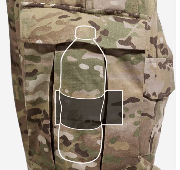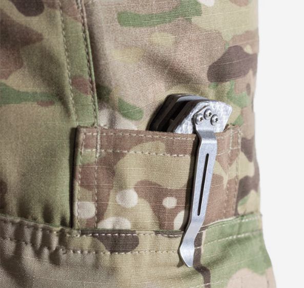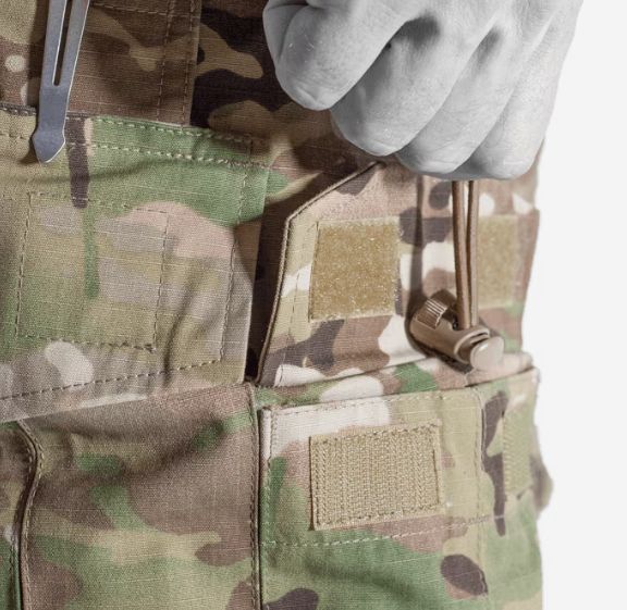 Il tessuto base è un Mil-Spec 50/50 NYCO ripstop durevole, rinforzato dai già citati inserti stretch. La chiusura è assicurata da una cerniera lampo con patta dotata di chiusura VELCRO®.
