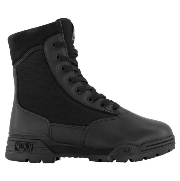 Stivale tattico Magnum Classic Black, design nato da collaborazione con FBI. Tomaia in pelle e mesh traspirante, hardware antiruggine. Soletta Magnum Comfort Plus, intersuola in EVA e suola in gomma ad alta trazione. Certificato EN ISO 20347:2012 OB E FO SRA. Peso 1680 gr.