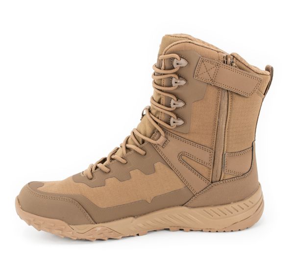 Stivale tattico Magnum Ultima 8.0 SZ WP Coyote Tan, impermeabile e traspirante. Tomaia in PU termosaldata con 45% di poliestere riciclato. Zip laterale per calzata rapida. Suola Michelin leggera e antiscivolo, intersuola EVA. Vegan Friendly. Certificato EN ISO 20347:2022 O1 E FO CI HI AN SR.