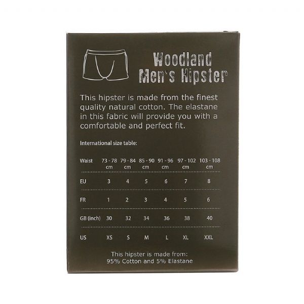 Il design include un morbido elastico in vita che non stringe e presenta una stampa del testo (textprint) che aggiunge un dettaglio estetico. La colorazione Woodland li rende adatti per chi predilige stampe mimetiche anche nell'intimo.