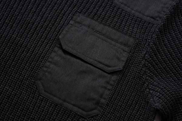 Il corpo principale del maglione è realizzato in maglia di acrilico, che assicura morbidezza e resistenza. Particolare attenzione è stata data alla durabilità, con sezioni rinforzate e robuste sui gomiti e sulle spalle, realizzate in 100% cotone, aree maggiormente soggette a usura.