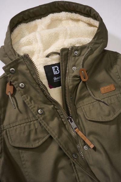 Parka donna Brandit Marsh Lake stile fishtail di alta qualità. Fodera trapuntata e pelliccia sintetica "teddy" morbida. Realizzato in 80% poliestere e 20% cotone. Vita regolabile con coulisse. Include numerose tasche e applicazioni in similpelle. Polsini a costine: 65% cotone, 35% poliestere.