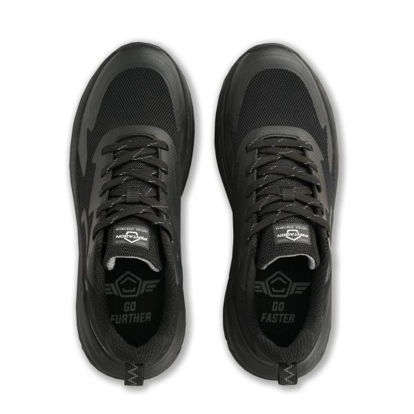 Sneakers Invictus Field nere di Pentagon, calzature tattiche unisex con tomaia in mesh traspirante, collarino imbottito, intersuola in EVA ad alto rimbalzo e suola in gomma Flexopull antiscivolo. Progettate per fornire trazione, supporto e comfort in movimento su superfici urbane e naturali.