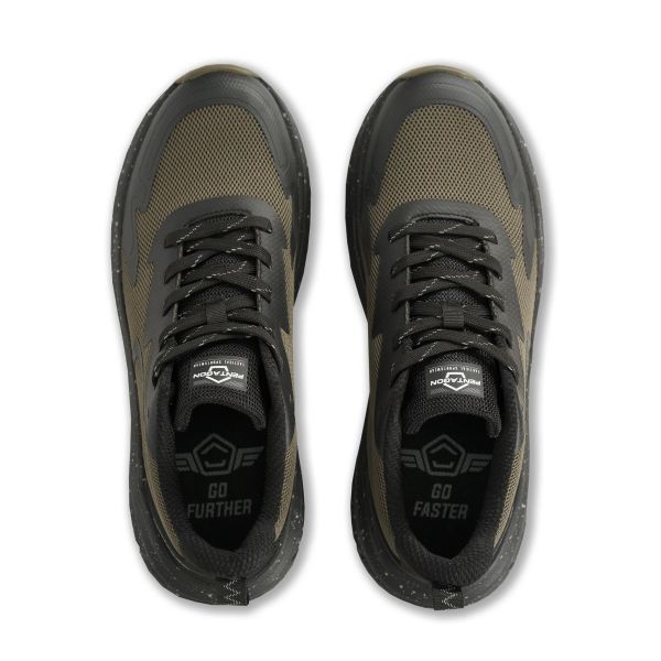 Sneakers Invictus Field Ranger Green di Pentagon, calzature tattiche unisex con tomaia in mesh traspirante, collarino imbottito, intersuola in EVA ad alto rimbalzo e suola in gomma Flexopull antiscivolo. Progettate per fornire trazione, supporto e comfort in movimento su superfici urbane e naturali.