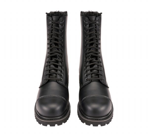 Anfibi militari Brandit Phantom a 14 buchi, versione invernale foderata. Realizzati in 100% vera pelle con fodera interna in poliestere effetto pelliccia. Punta in acciaio rinforzata e suola in gomma con profilo incollato e cucito per massima stabilità e calore.