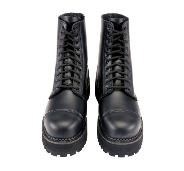 Anfibi Brandit Plateau a 10 buchi in 100% vera pelle (interno ed esterno). Caratterizzati da suola platform in gomma con profilo a carrarmato, incollata e cucita. Punta rinforzata in acciaio (steel toe cap) per massima protezione e design robusto.