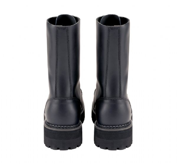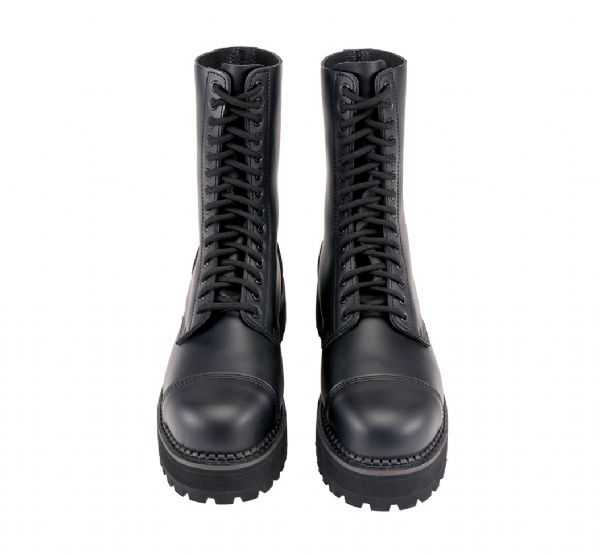 Anfibi Brandit Phantom Plateau a 14 buchi in 100% vera pelle. Suola platform alta in gomma, incollata e cucita per la massima resistenza. Punta rinforzata in acciaio (steel toe cap). Allacciatura alta a 14 fori per protezione e supporto della gamba.