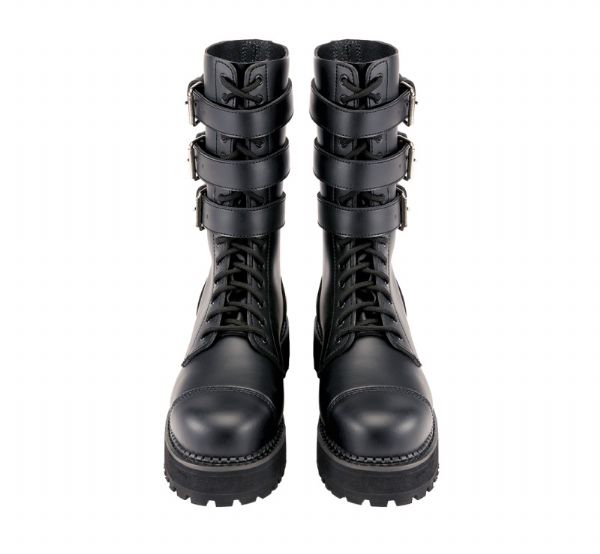 Anfibi Brandit Phantom Plateau con 3 fibbie in pelle sul gambale. Realizzati in 100% vera pelle (interno ed esterno). Suola platform in gomma con profilo a carrarmato, incollata e cucita. Punta rinforzata in acciaio (steel toe cap). Massima robustezza.