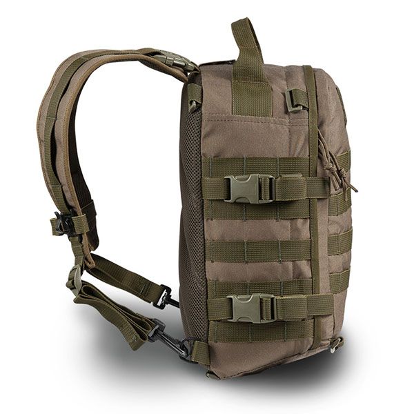 Il Wisport Sparrow 16 è dotato di un’unica ampia camera principale con grande apertura a zip e divisoni interne per accessori, oltre a tasche frontali per strumenti o documenti. Il pannello frontale con sistema *Velcro ID* consente l’applicazione di patch identificative o targhette operative. L’organizzazione interna include spazio per una sacca idrica e un mini-organizer per piccoli oggetti. Lo zaino può essere utilizzato anche come *drop bag* attaccabile ad uno zaino più grande grazie agli spallacci rimovibili e agli attacchi MOLLE esterni, offrendo versatilità di utilizzo in contesti tattici e ricreativi.