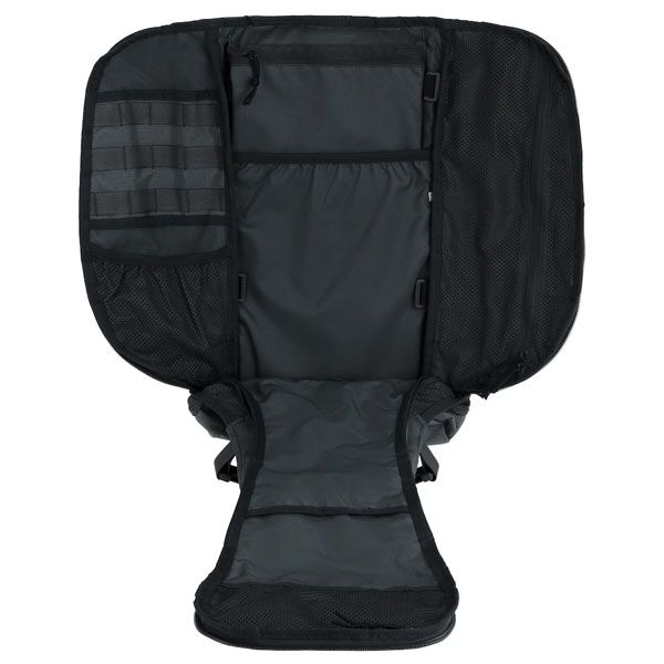 Lo zaino è organizzato con una singola camera principale ma dotata di scomparti e tasche interne che favoriscono l’organizzazione del carico. Il pannello interno compatibile con il sistema MOLLE permette l’integrazione di tasche aggiuntive. Sul pannello frontale è presente una superficie Velcro per badge o patch operative. L’esterno è dotato di MOLLE, fettucce per fissaggio di bastoni da trekking o sci, maniglie laterali e cinghie di compressione. Nel doppio fondo è alloggiata una copertura antipioggia che protegge il contenuto in condizioni meteorologiche avverse.