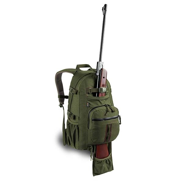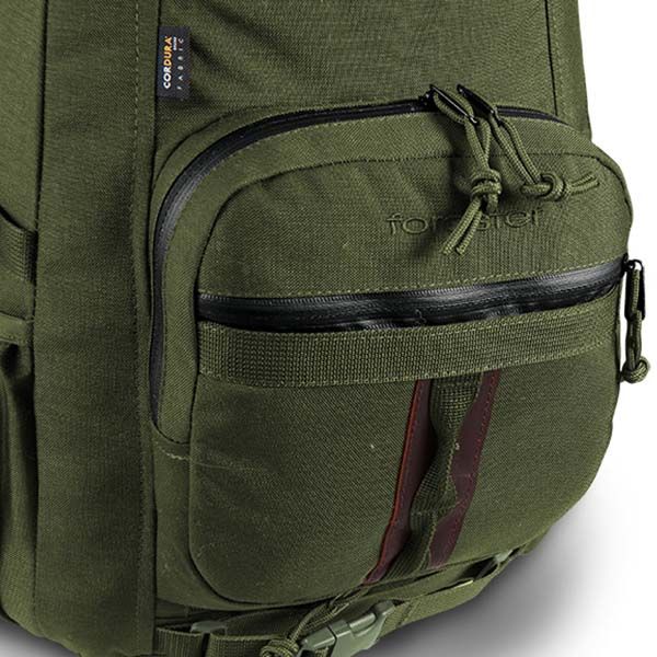 La struttura del Forester prevede una singola camera principale di 28L con divisorio interno, utile per separare equipaggiamento tecnico, abbigliamento e attrezzi di supporto. La tasca frontale con zip splash-proof permette di proteggere gli oggetti sensibili alla pioggia, mentre due tasche laterali offrono spazio per accessori come borracce o caricatori. Un pannello e tasca estensibile consentono il trasporto sicuro di armi, mantenendo libero il movimento delle braccia. Il sistema di cinghie di compressione laterali riduce il volume e stabilizza il carico. Spallacci ergonomici, pas piesterno e cintura lombare regolabile distribuiscono il peso uniformemente sulla schiena.