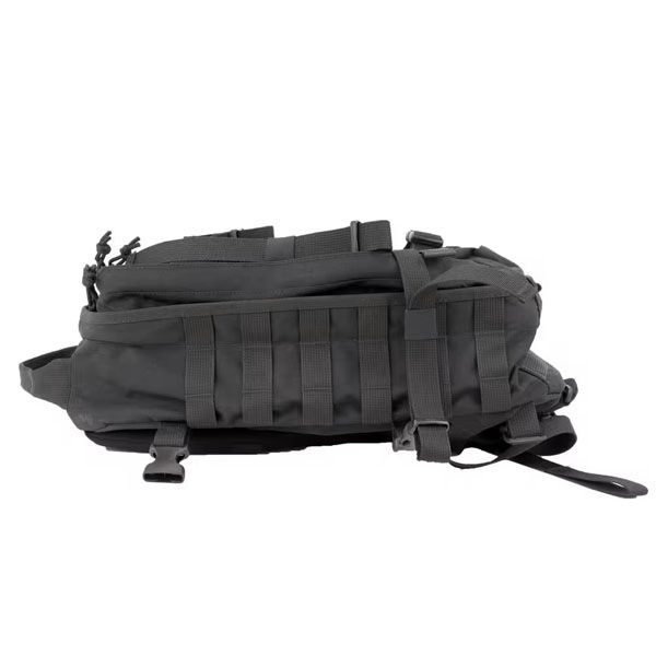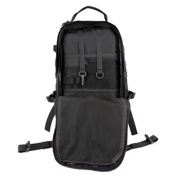 Il pannello frontale integra un sistema MOLLE per il fissaggio di tasche e accessori modulari, ampliando la capacità operativa dello zaino. Le cinghie di compressione laterali permettono di regolare il volume in base al carico trasportato, migliorando la stabilità durante il movimento. Lo zaino è compatibile con sistemi di idratazione tipo CamelBak, grazie al passaggio dedicato per il tubo di bevanda, rendendolo adatto a utilizzi dinamici e continuativi.
