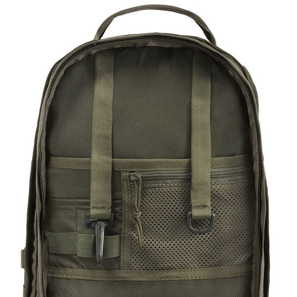 Il pannello frontale integra un sistema MOLLE per il fissaggio di tasche e accessori modulari, ampliando la capacità operativa dello zaino. Le cinghie di compressione laterali permettono di regolare il volume in base al carico trasportato, migliorando la stabilità durante il movimento. Lo zaino è compatibile con sistemi di idratazione tipo CamelBak, grazie al passaggio dedicato per il tubo di bevanda, rendendolo adatto a utilizzi dinamici e continuativi.