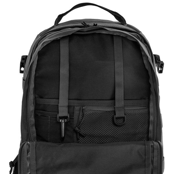 Il pannello frontale integra un sistema MOLLE per il fissaggio di tasche e accessori modulari, ampliando la capacità operativa dello zaino. Le cinghie di compressione laterali permettono di regolare il volume in base al carico trasportato, migliorando la stabilità durante il movimento. Lo zaino è compatibile con sistemi di idratazione tipo CamelBak, grazie al passaggio dedicato per il tubo di bevanda, rendendolo adatto a utilizzi dinamici e continuativi.
