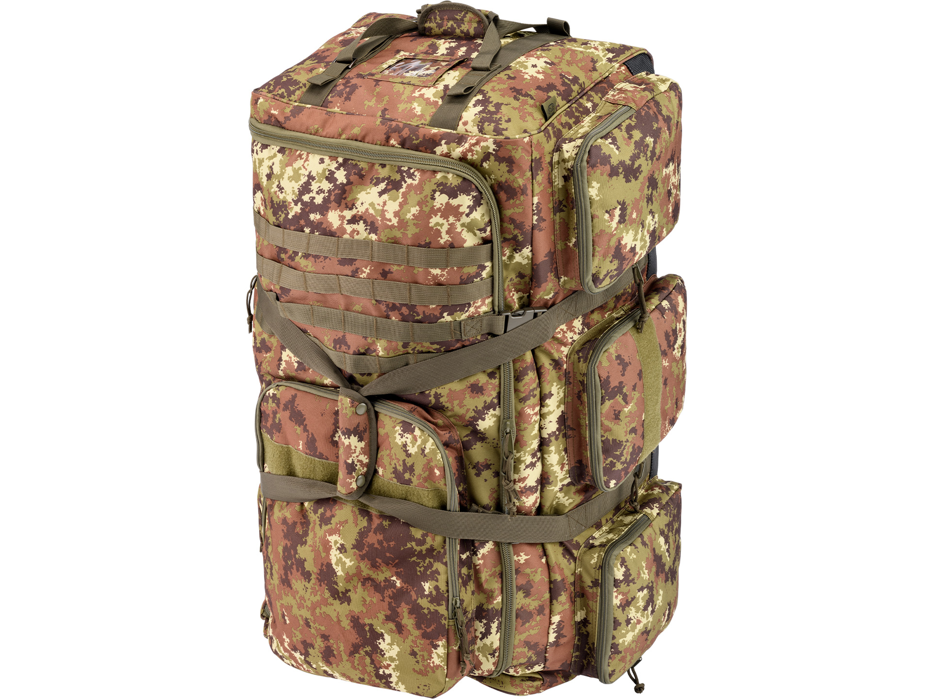 Borsone trolley da 135 litri realizzato in tessuto 900D, dotato di tasche laterali e sistema MOLLE per accessori. Ideale per utilizzo militare e outdoor.